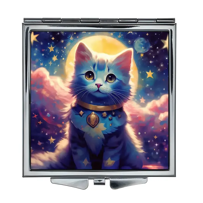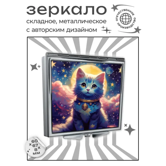 Складное квадратное зеркало с изображением кошки на фоне ночного неба. Изготовлено из металла и стекла.