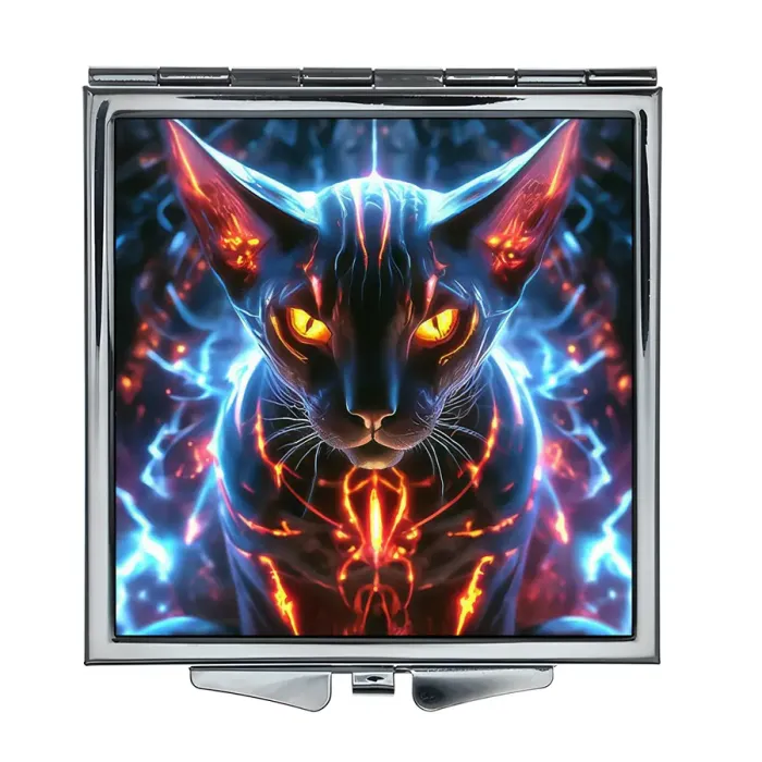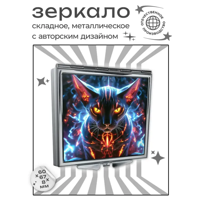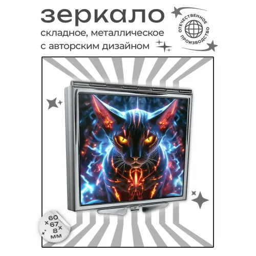 Складное квадратное зеркало с изображением Молниевого кота, изготовленное из металла и стекла.