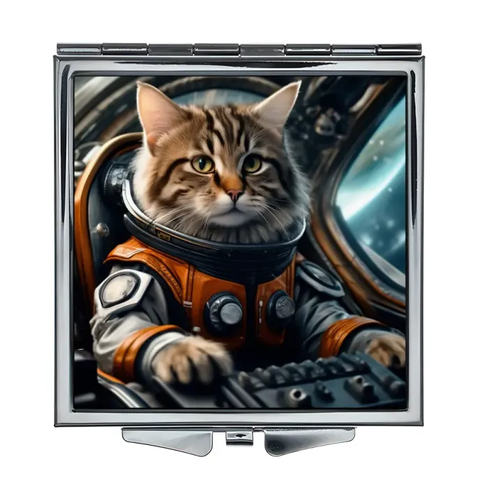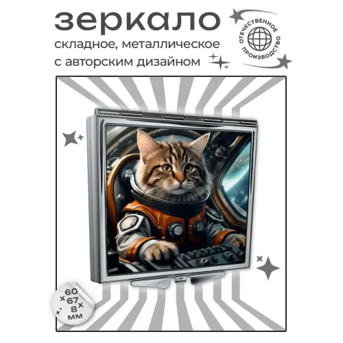Складное зеркало квадратной формы с изображением кота-пилота. Изготовлено из металла и стекла.