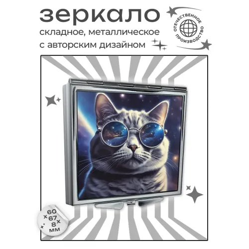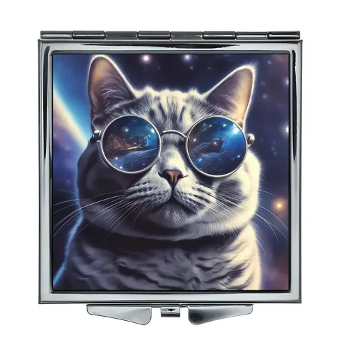 Складное зеркало квадратной формы с изображением британского кота в очках.