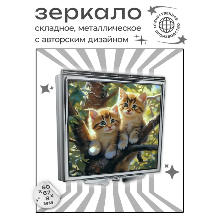 Складное зеркало квадратной формы с изображением котят на дереве. Изготовлено из металла и стекла.