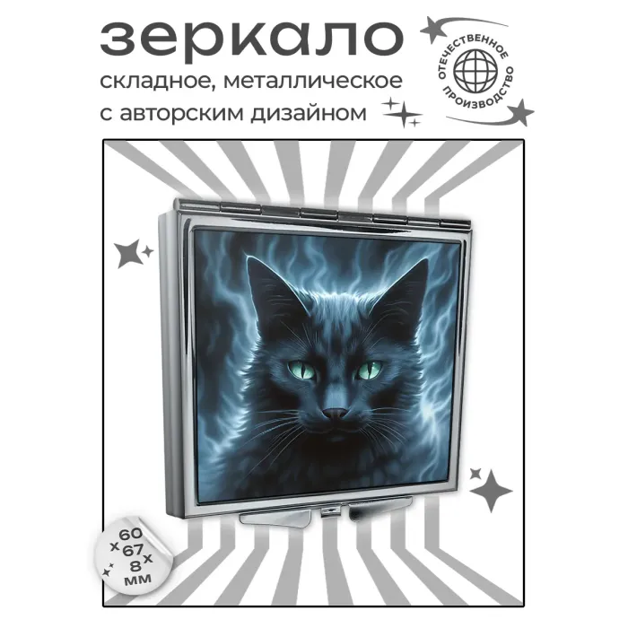 Складное квадратное зеркало с полноцветным изображением магического кота на металлической поверхности.