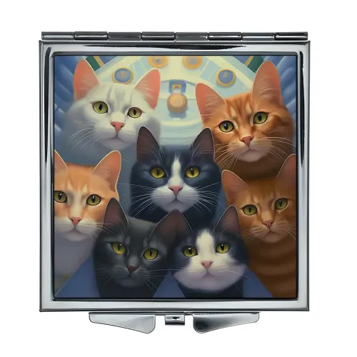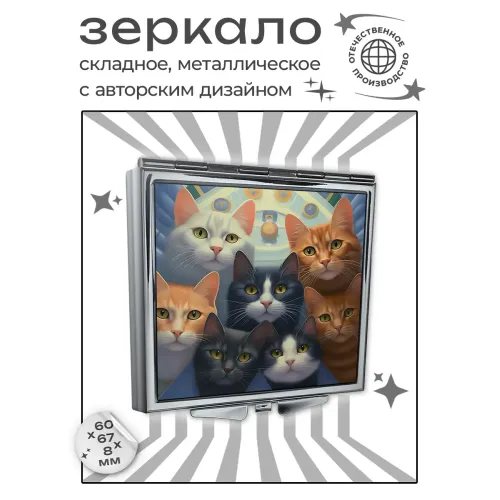 Складное зеркало квадратной формы с изображением котов. Изготовлено из металла и стекла.