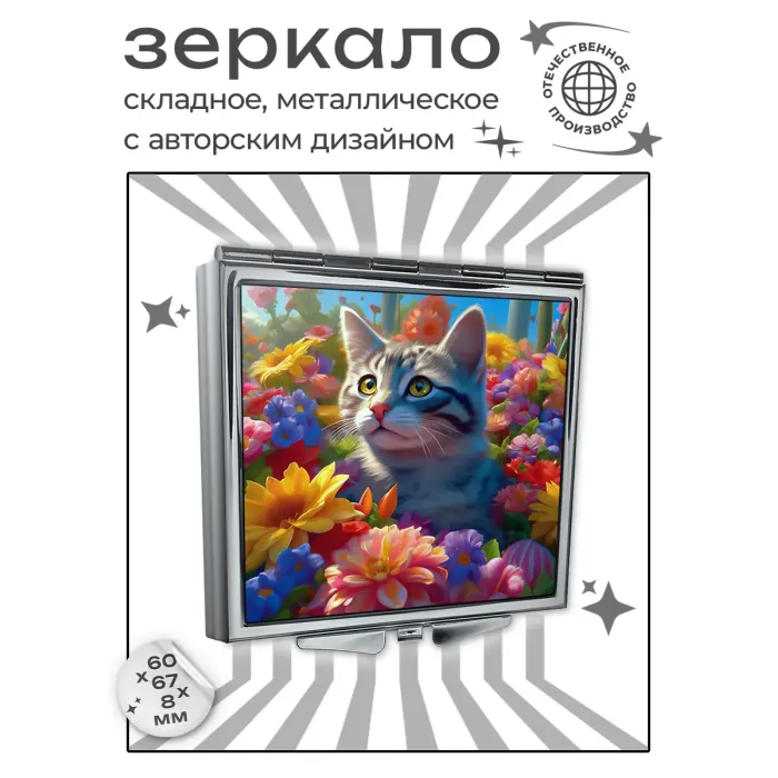 Складное квадратное зеркало с изображением кошки на фоне цветов. Изготовлено из металла и стекла.