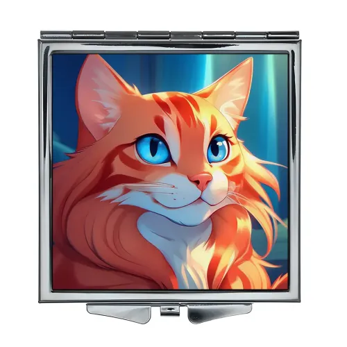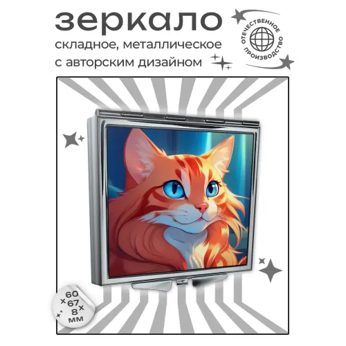 Складное квадратное зеркало с полноцветным изображением рыжей кошки. Материалы: металл и стекло.