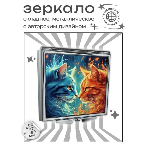 Складное зеркало квадратной формы с изображением кота и кошки. Изготовлено из металла и стекла.