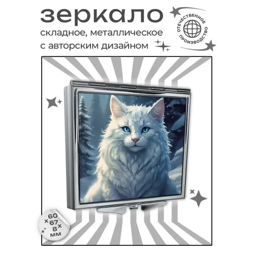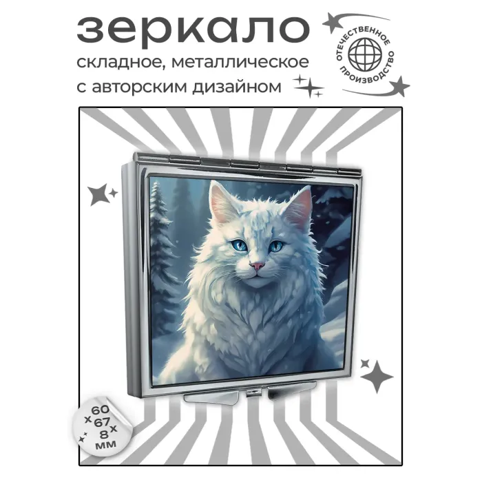Складное зеркало квадратной формы с изображением кошки в зимнем стиле. Изготовлено из металла и стекла.