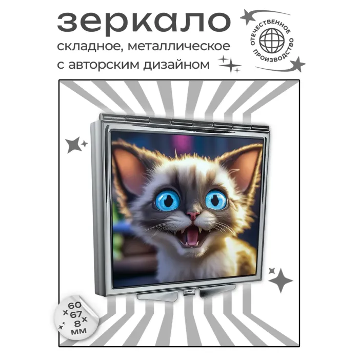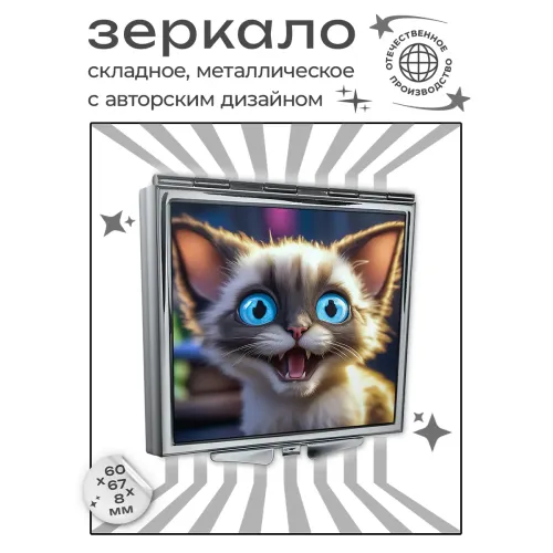 Складное зеркало квадратной формы с изображением мордочки котёнка. Изготовлено из металла и стекла.