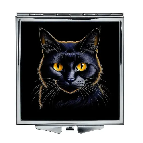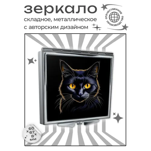 Складное зеркало квадратной формы с полноцветным изображением чёрного кота.