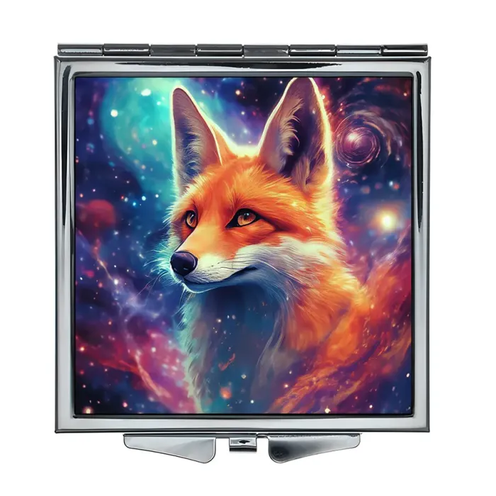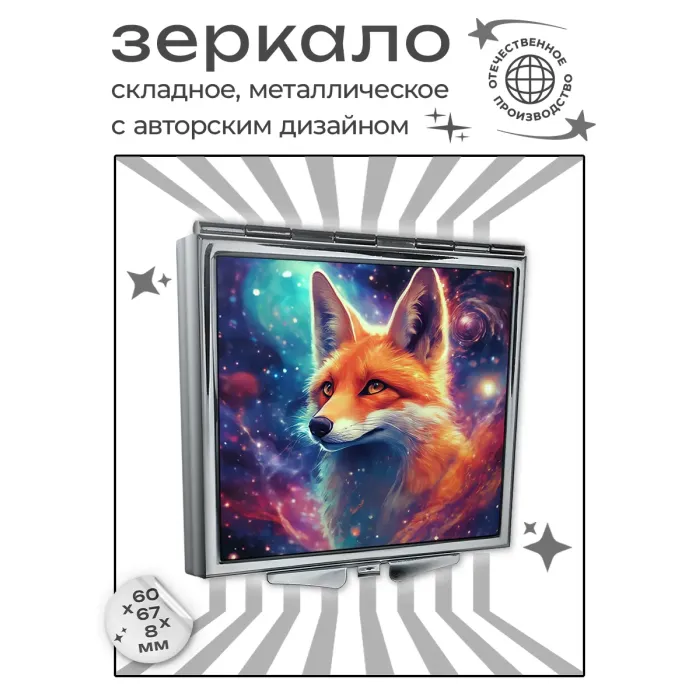 Складное зеркало квадратной формы с изображением «Космическая лиса». Изготовлено из металла и стекла с полноцветной печатью.
