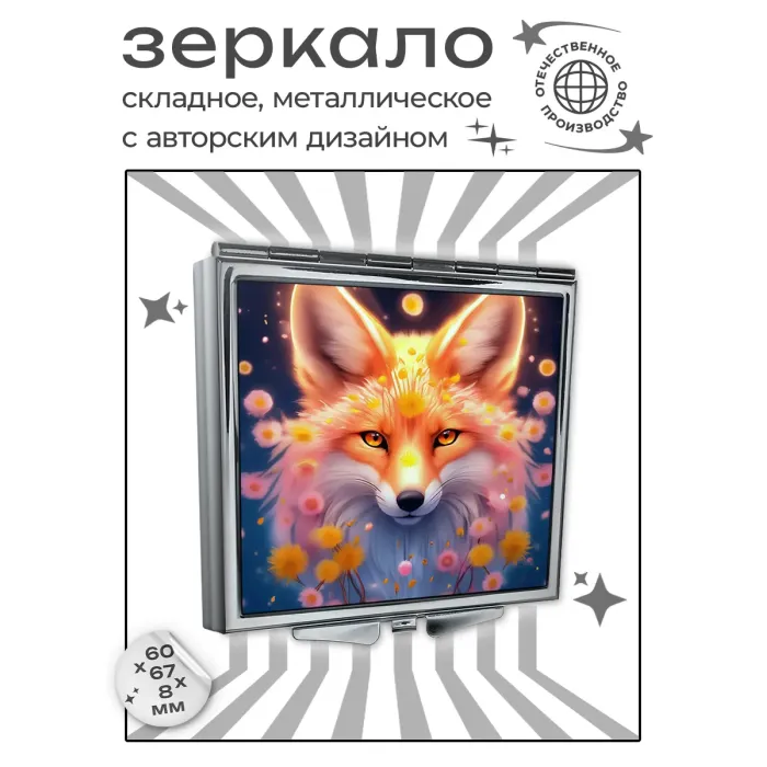 Складное зеркало квадратной формы с изображением лисы и цветов. Изготовлено из металла и стекла.