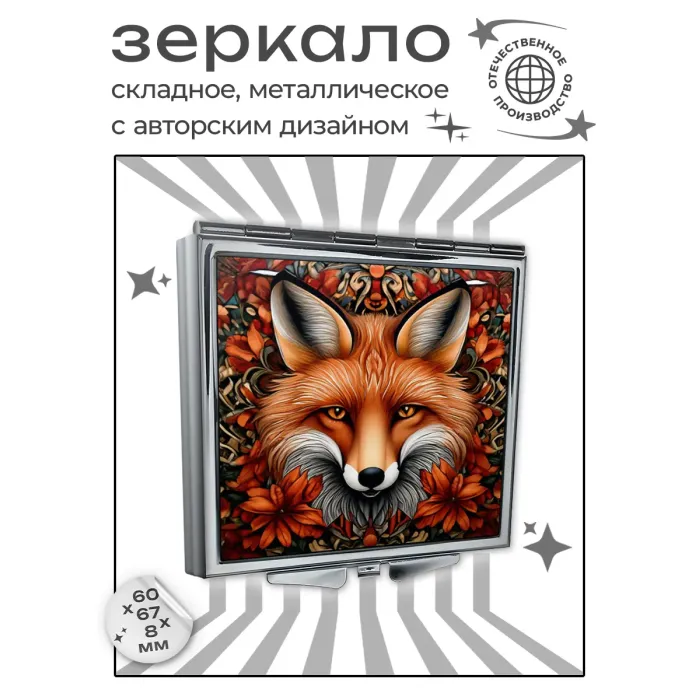 Складное зеркало квадратной формы с изображением лисы. Изготовлено из металла и стекла.