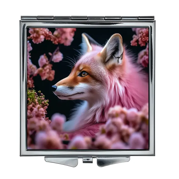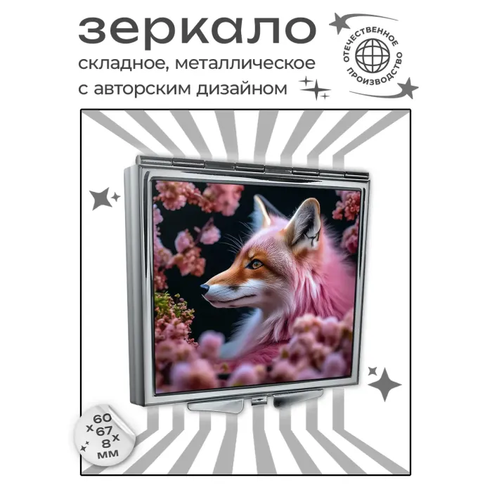 Складное зеркало квадратной формы с изображением лисы в профиль. Изготовлено из металла и стекла с полноцветной печатью.