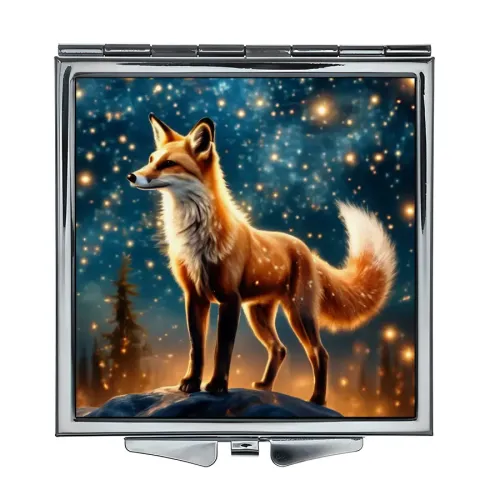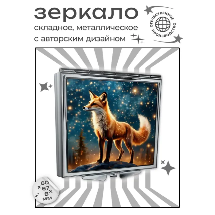 Складное зеркало квадратной формы с изображением лисы. Сувенирный или дорожный аксессуар.