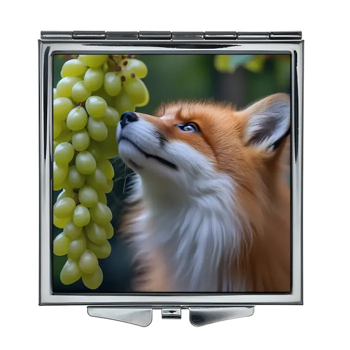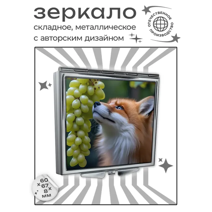 Складное зеркало с полноцветным изображением лисы и винограда на металлической поверхности.