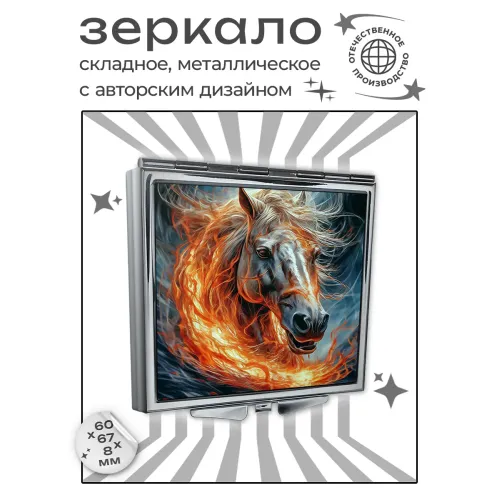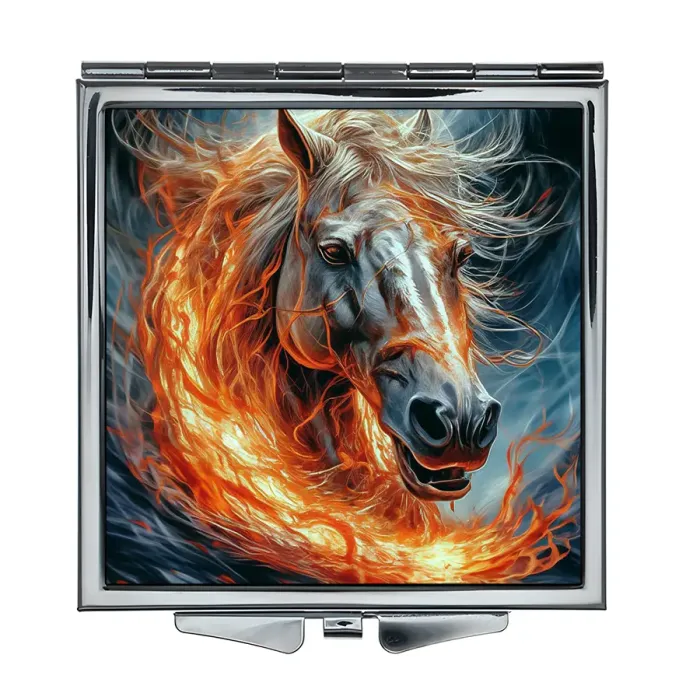 Складное квадратное зеркало с полноцветным изображением коня и огня. Изготовлено из металла и стекла.
