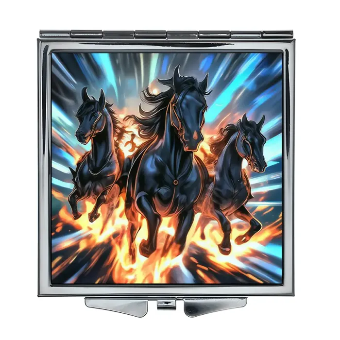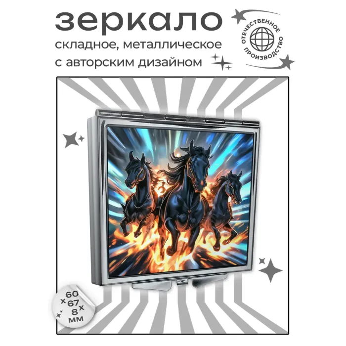 Складное квадратное зеркало с полноцветным изображением на металлической основе.
