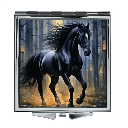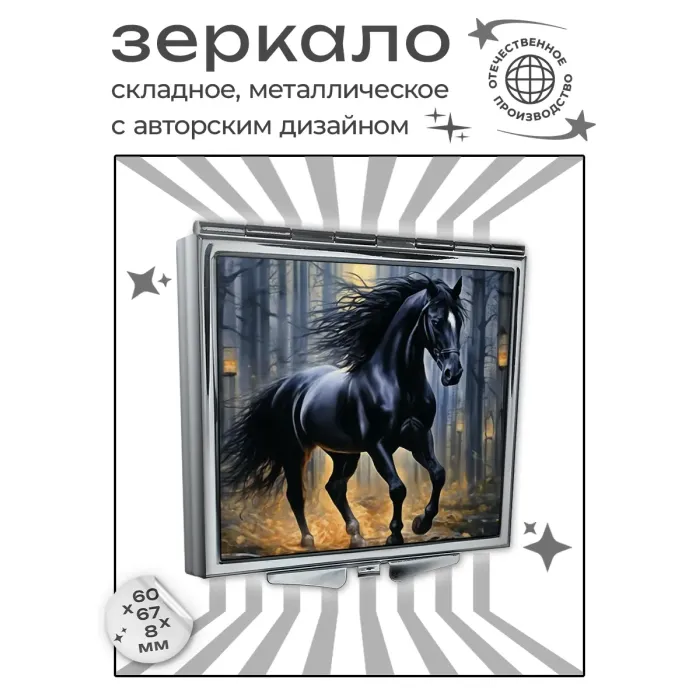Складное зеркало квадратной формы с изображением чёрной лошади. Изготовлено из металла и стекла.