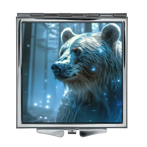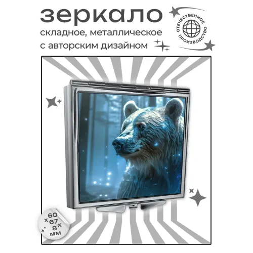 Складное зеркало квадратной формы с изображением медведя. Материалы: металл и стекло.