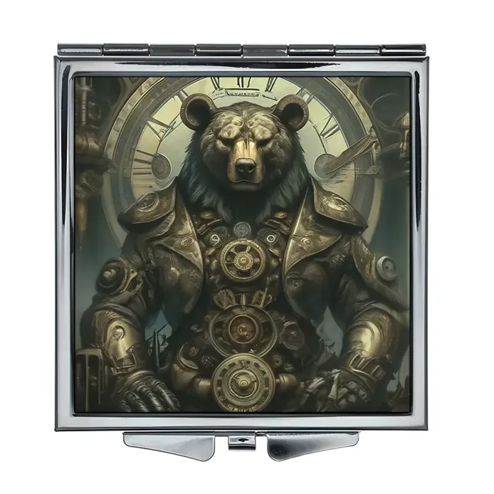 Складное зеркало квадратной формы с изображением медведя в стиле стимпанк.