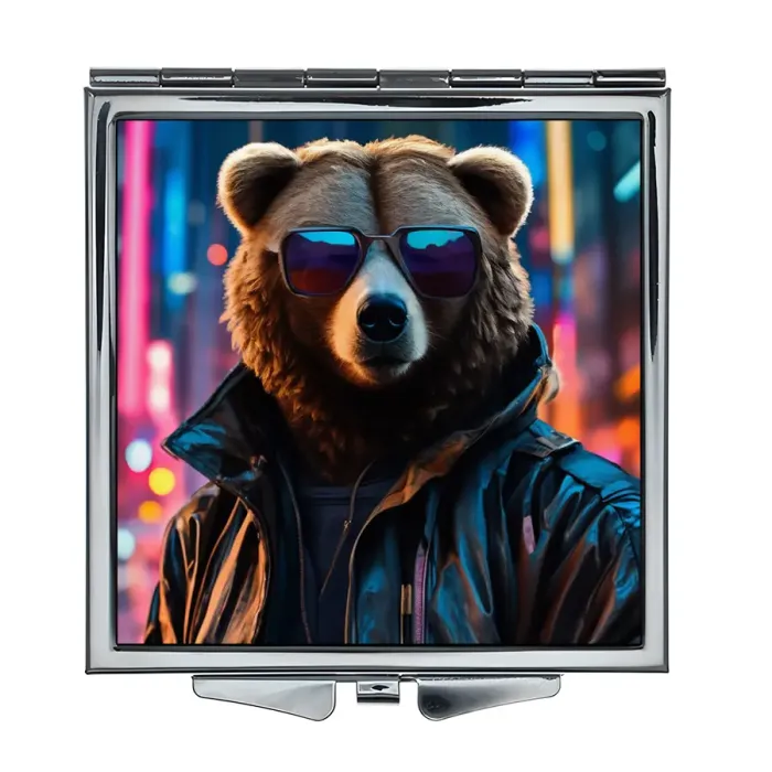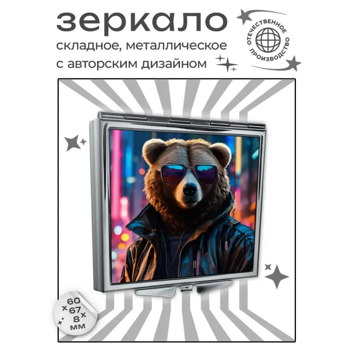 Складное зеркало квадратной формы с полноцветным изображением медведя в очках.