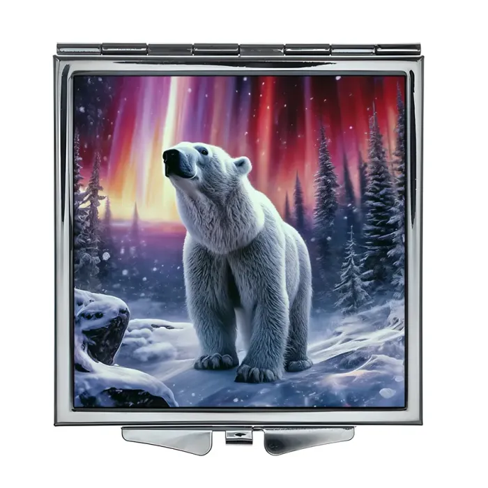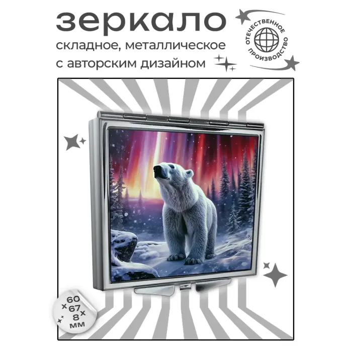 Складное зеркало квадратной формы для личного использования. Материалы: металл и стекло. Изображение белого медведя на фоне северного сияния нанесено методом полноцветной печати.