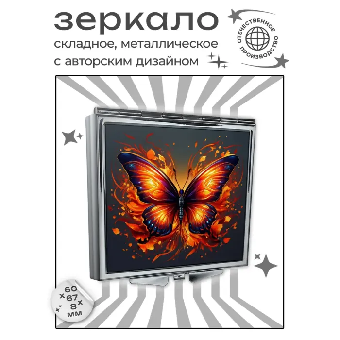 Складное зеркало квадратной формы с изображением красной бабочки. Изготовлено из металла и стекла.