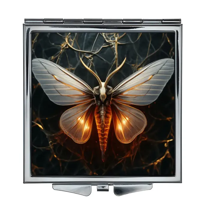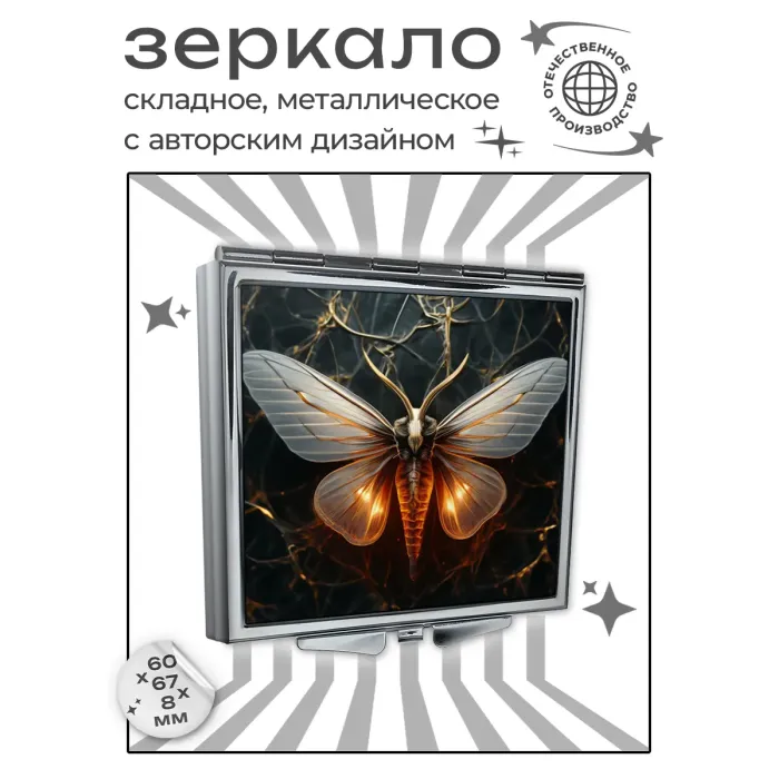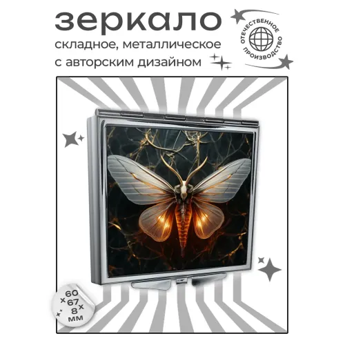 Складное зеркало квадратного формата с изображением мотылька. Изготовлено из металла и стекла.