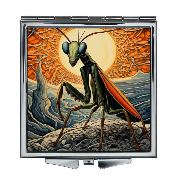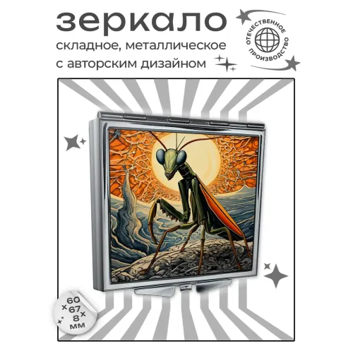 Складное зеркало квадратной формы с изображением богомола. Изготовлено из металла и стекла.