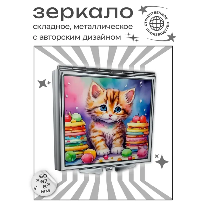 Складное квадратное зеркало для личного пользования из металла и стекла с полноцветной печатью изображения.