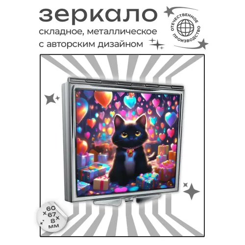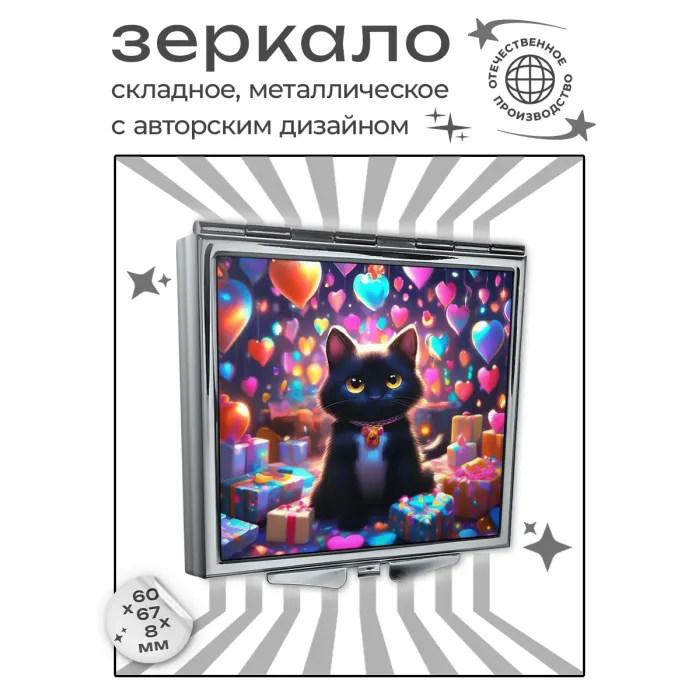 Складное квадратное зеркало с изображением кота. Материал: металл и стекло.