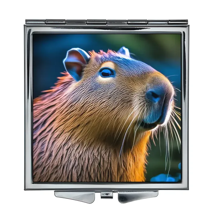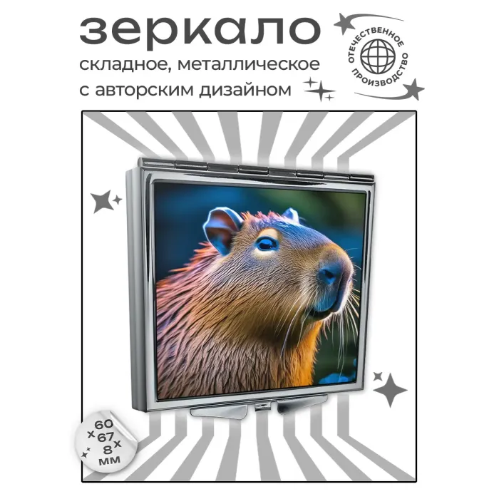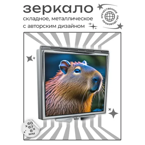 Складное зеркало квадратной формы с изображением капибары. Изготовлено из металла и стекла.