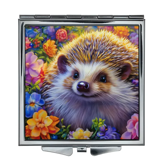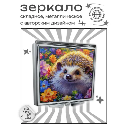 Складное зеркало квадратной формы с изображением ёжика среди цветов.