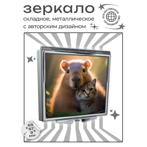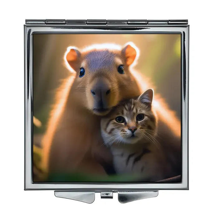 Складное квадратное зеркало с полноцветным изображением капибары и кошки.
