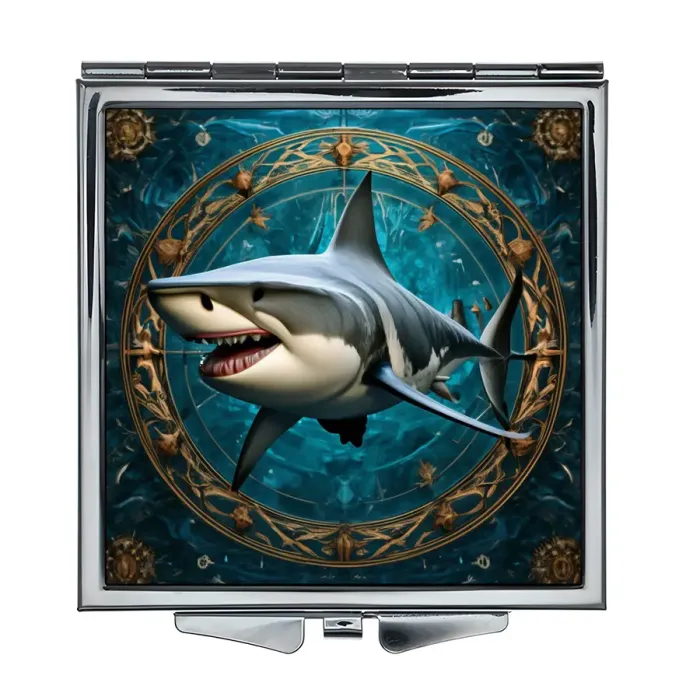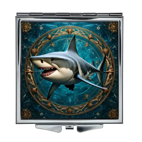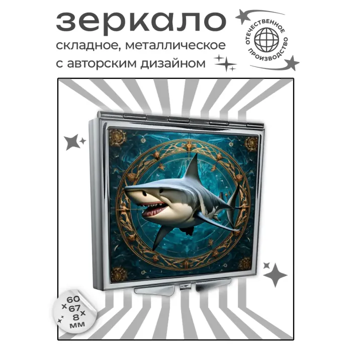 Складное зеркало квадратной формы с изображением акулы. Изготовлено из металла и стекла.