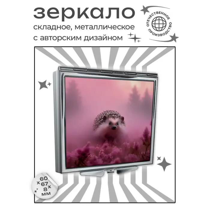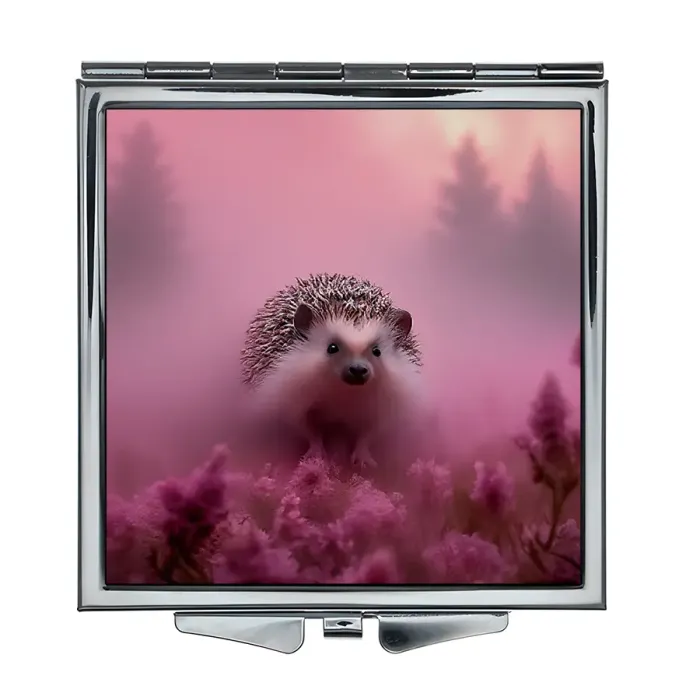 Складное квадратное зеркало с полноцветным изображением ёжика в розовом тумане.