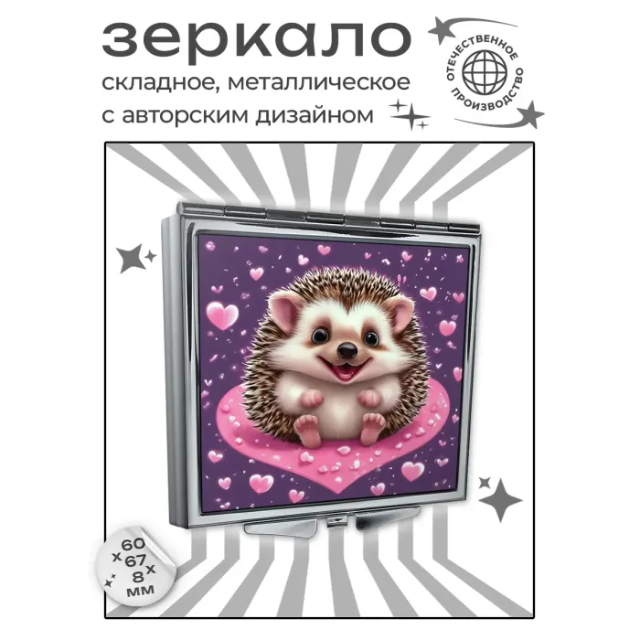 Складное зеркало квадратной формы с изображением ёжика, символизирующего нежность и заботу. Это компактное зеркальце станет отличным спутником в повседневной жизни, позволяя всегда быть на высоте. Изготовлено из качественного металла и стекла, оно отличается прочностью и долговечностью.