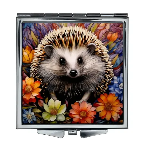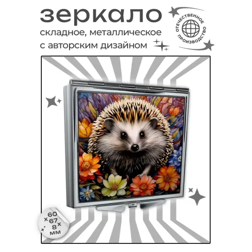 Складное зеркало квадратной формы для личного использования. Материалы: металл и стекло. Дизайн с полноцветной печатью изображения ёжика на фоне цветов.