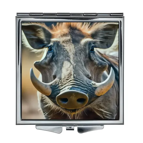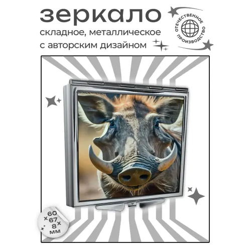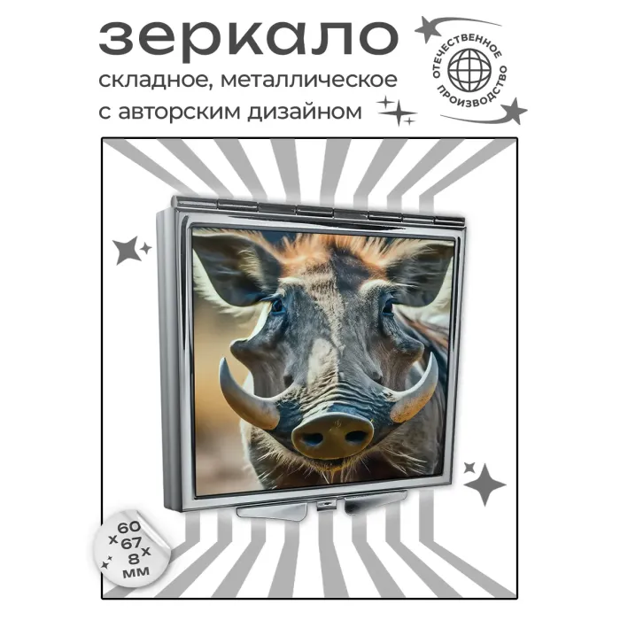 Складное зеркало квадратной формы для личного использования. Материалы: металл и стекло. Изображение кабана нанесено методом полноцветной печати.