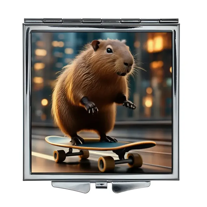 Складное квадратное зеркало с полноцветным изображением капибары на скейтборде.