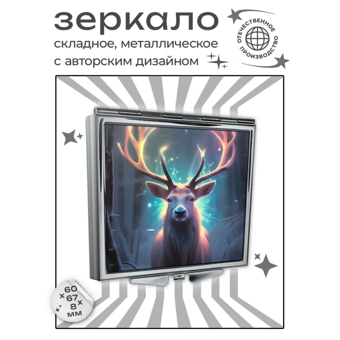 Складное зеркало квадратной формы с изображением оленя. Изготовлено из металла и стекла.
