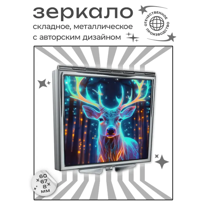 Складное зеркало квадратной формы с изображением оленя. Материалы: металл, стекло.