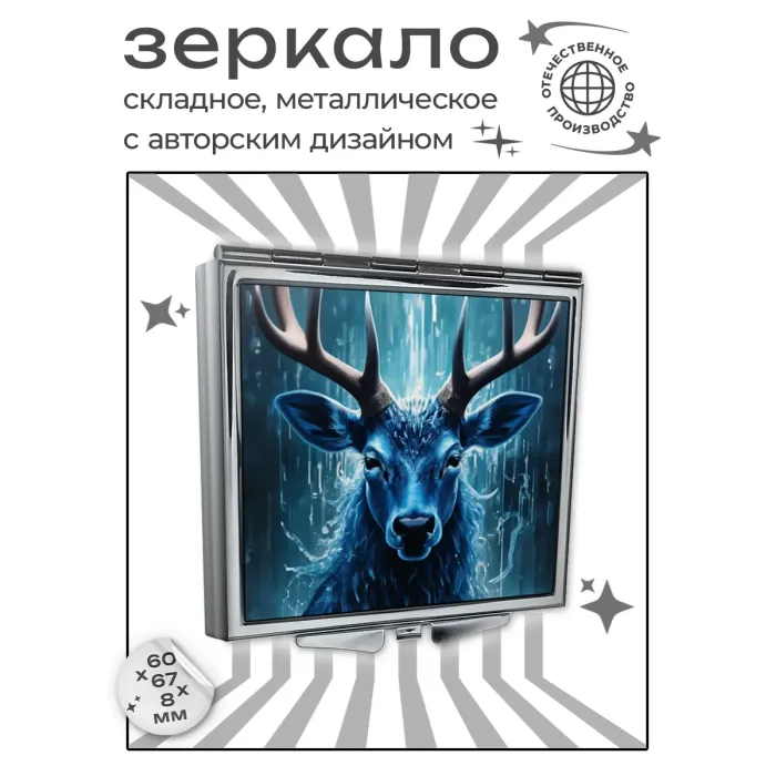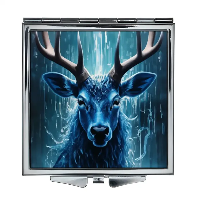 Складное зеркало квадратной формы для личного использования. Материал: металл и стекло. Дизайн: полноцветное изображение оленя под дождем.