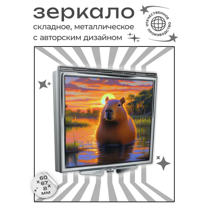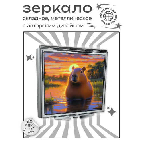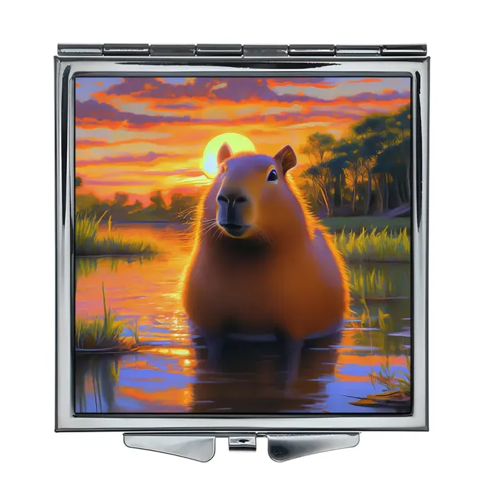 Складное зеркало квадратной формы с изображением капибары на рассвете — это не только практичный аксессуар, но и стильный элемент декора. Оно идеально подходит для использования в дороге или в повседневной жизни благодаря своим компактным размерам 60х67х8 мм.