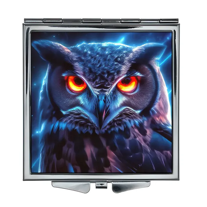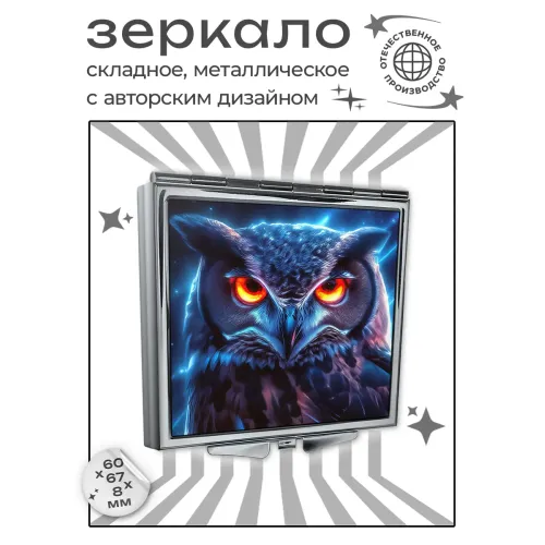Складное зеркало квадратной формы с изображением совы. Изготовлено из металла и стекла.