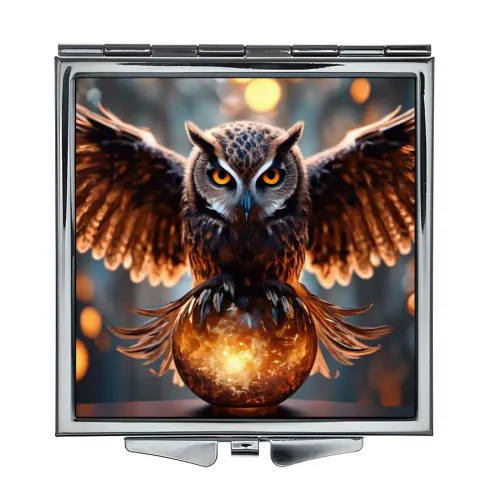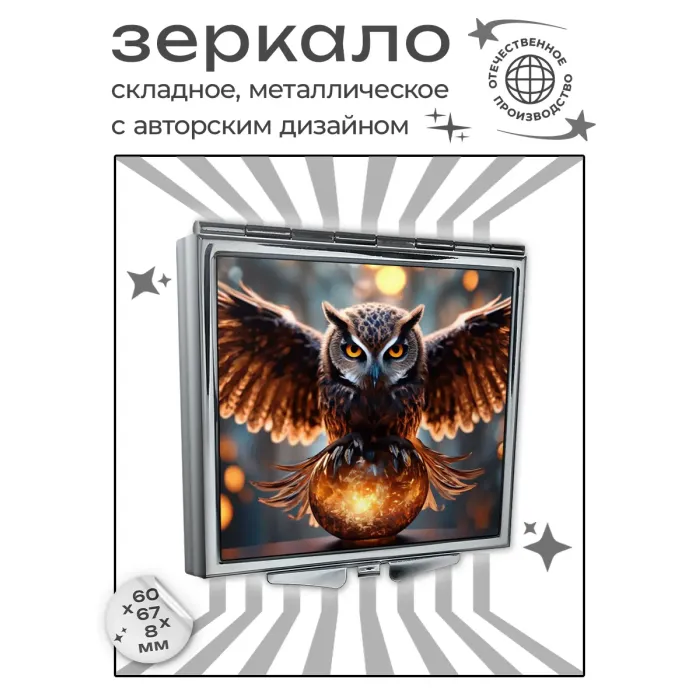 Складное зеркало квадратной формы для личного использования. Материал: металл и стекло. Дизайн включает полноцветное изображение совы и шара.