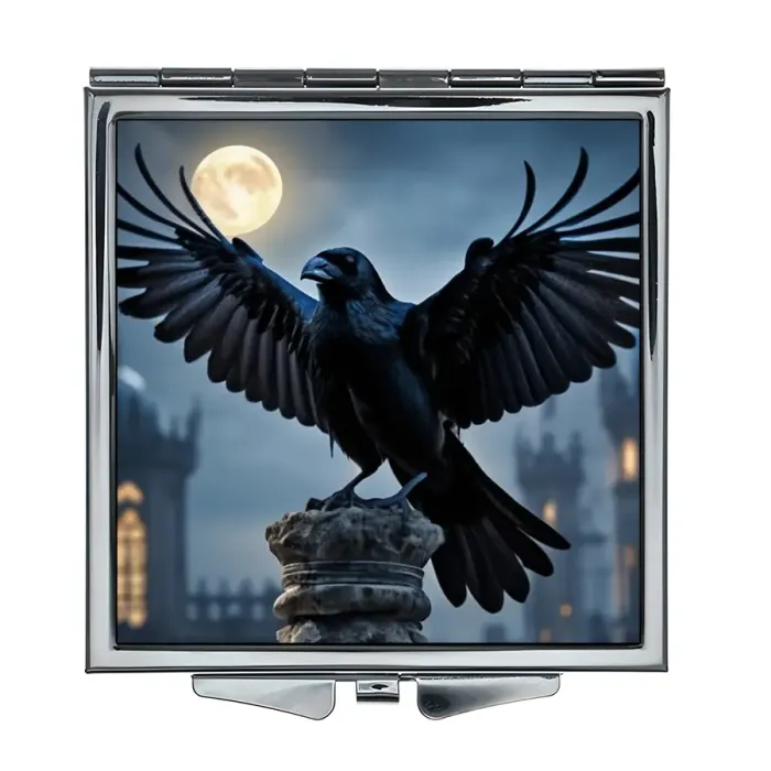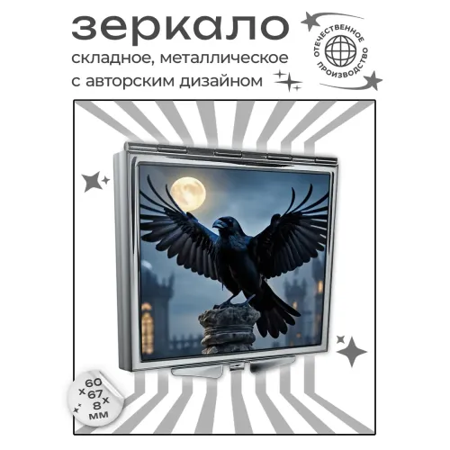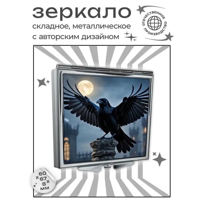 Складное зеркало квадратной формы с изображением вороны.
