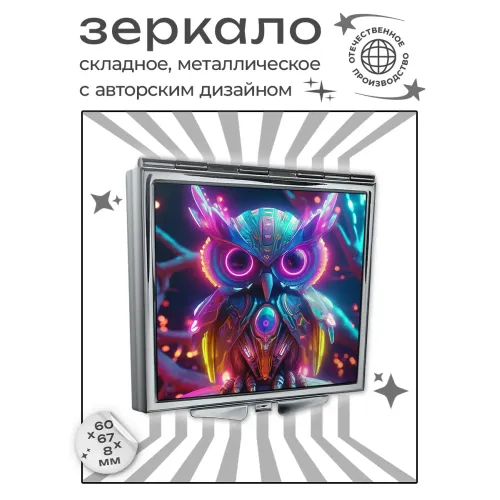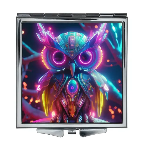 Складное зеркало квадратной формы с изображением совы в стиле киберпанк.