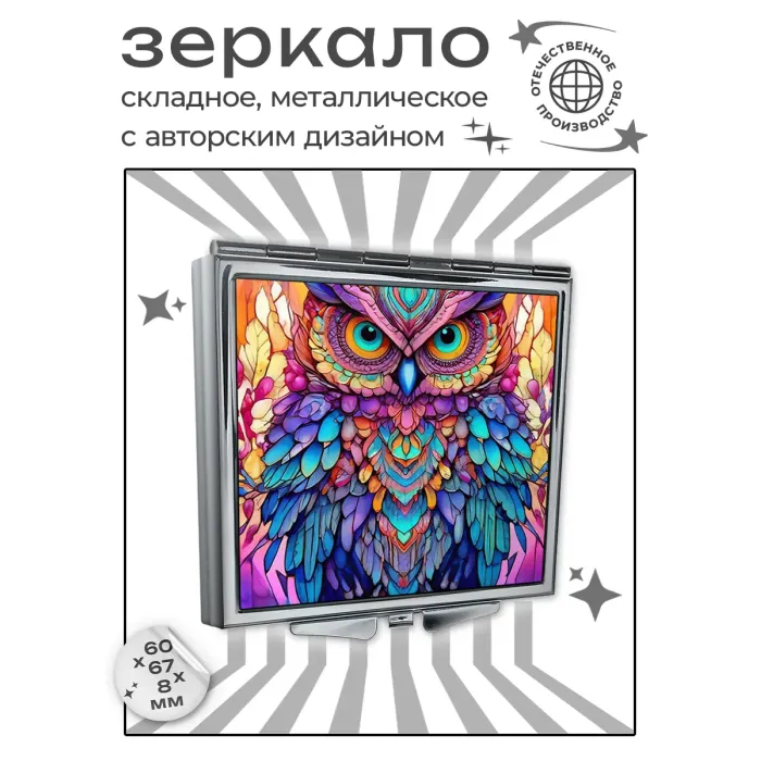 Складное зеркало квадратной формы с иллюстрацией совы. Изготовлено из металла и стекла.