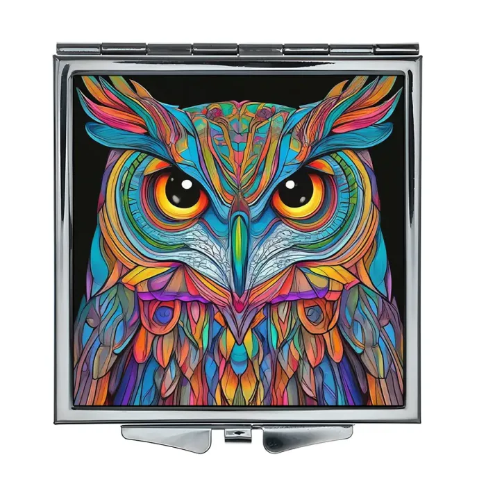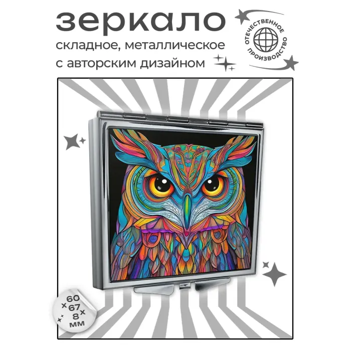 Складное зеркало квадратной формы с полноцветным изображением совы на металлической поверхности.